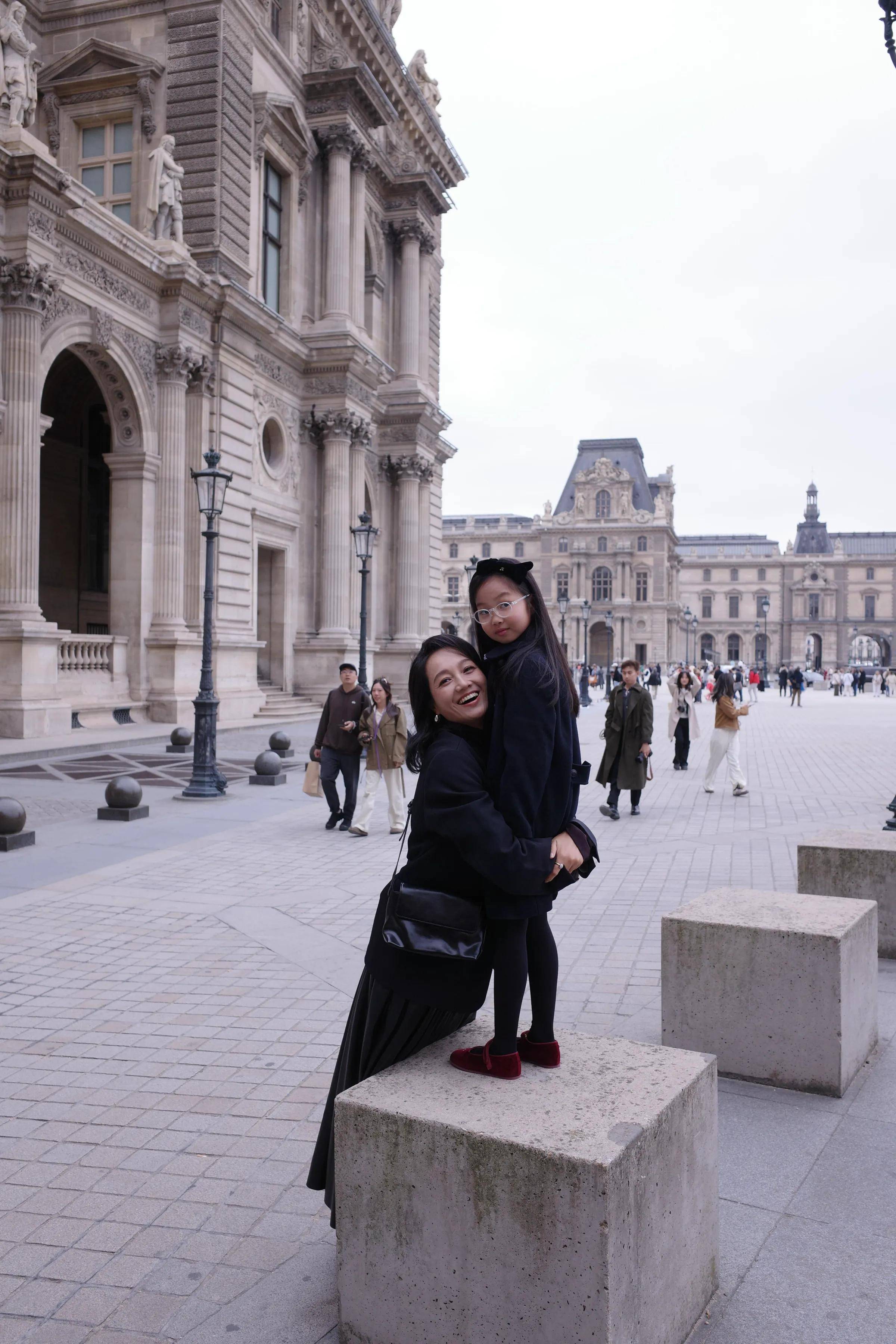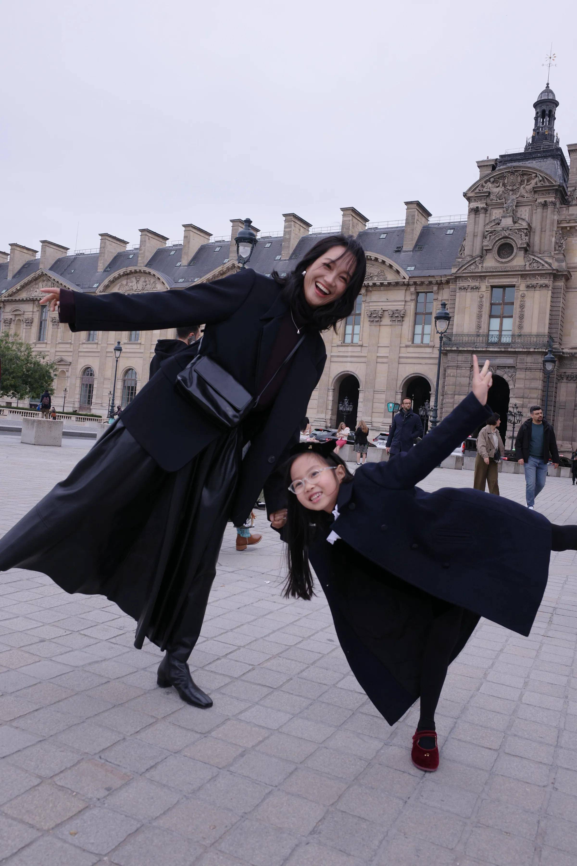 照片中,母女俩还一起在巴黎著名景点打卡拍照。朱丹身穿黑色大衣搭配黑色裙子,全黑look看起来超显气质。女儿也是all black 造型,穿着黑色大衣搭配黑色连衣裙,和妈妈组亲子装好有爱。母女俩同框超有爱,一起对着镜头露出灿烂笑容,看的出来是真的很开心呀。